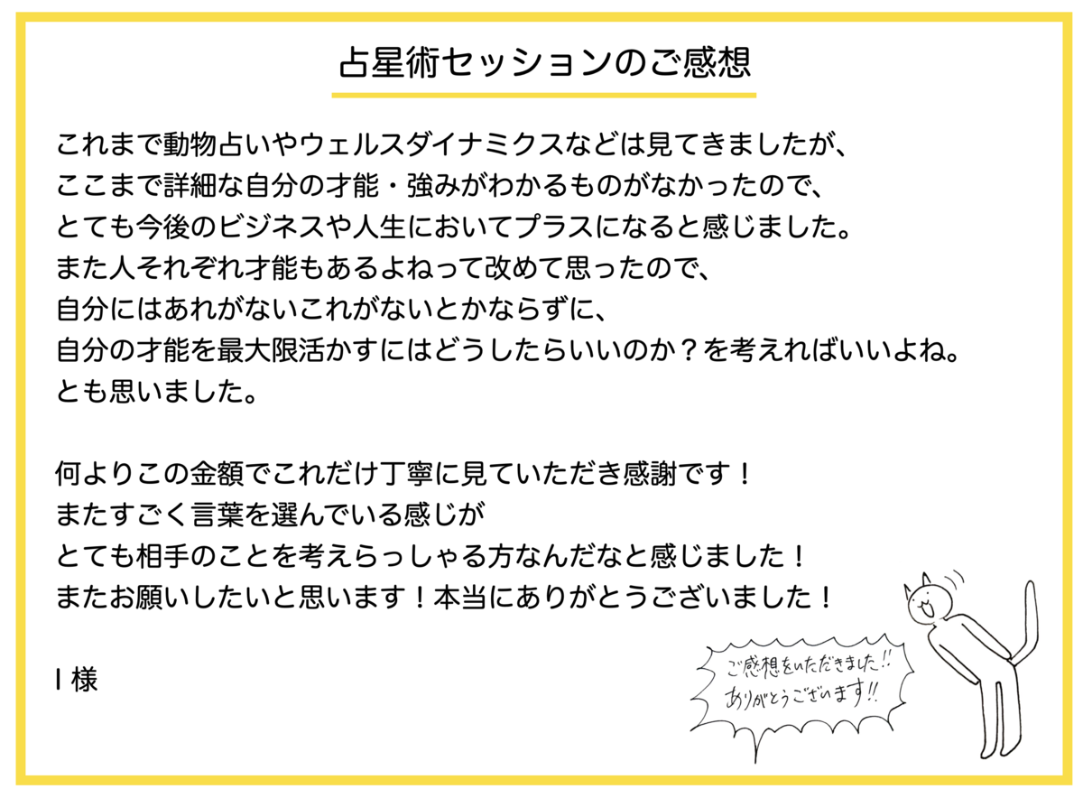 2023-08-10 占星術セッションのご感想(I様、I様、M様、M様) ご感想 こんにちは。「ねこちゃん先生」こと、占星術家の竹内です。占星術セッションを受けてくださったお客様からいただいたご感想を紹介いたします。(ご本人から掲載の許可をいただいています。) I様のご感想 I様のご感想 M様のご感想 M様のご感想 I様のご感想 I様のご感想 M様のご感想 M様のご感想